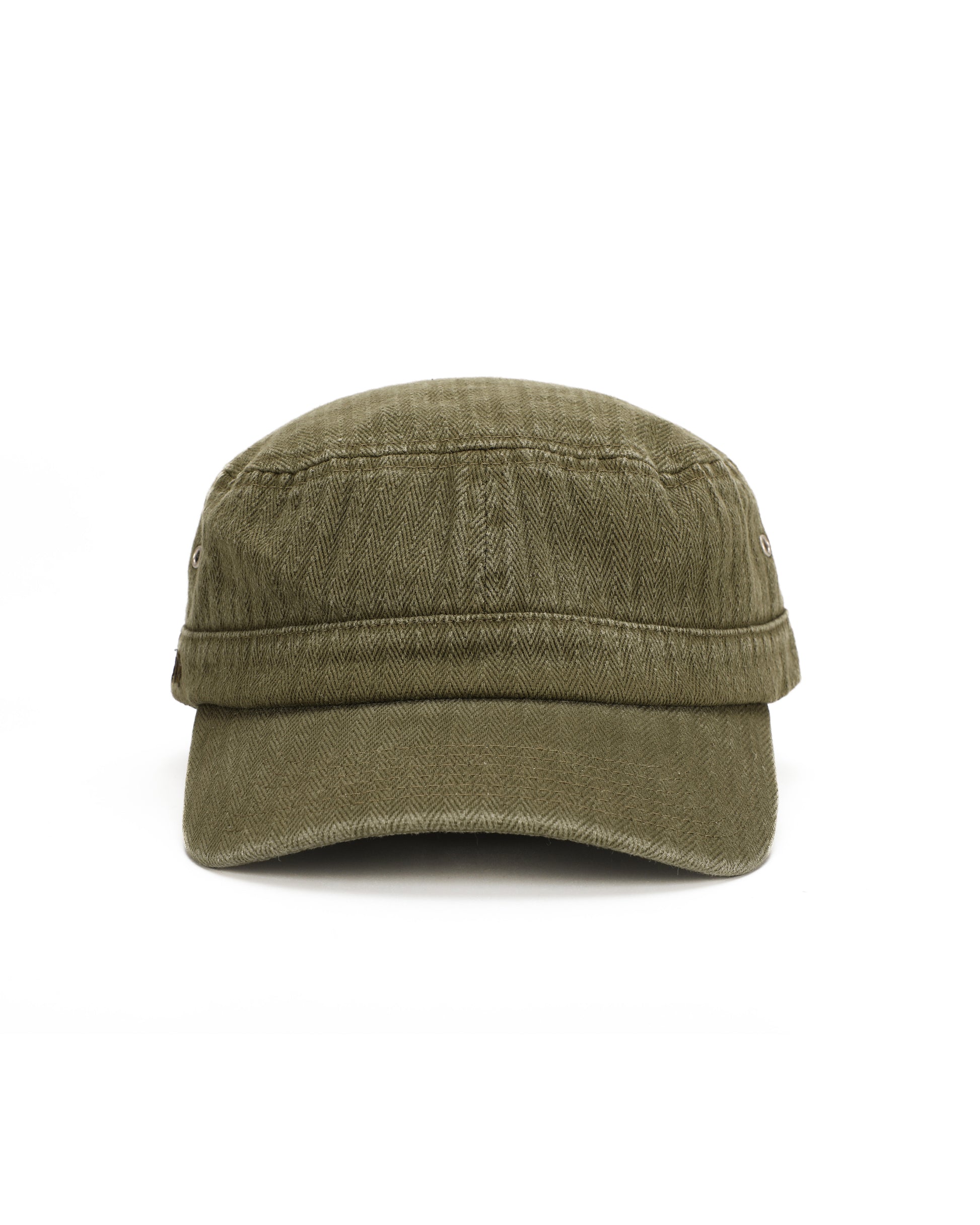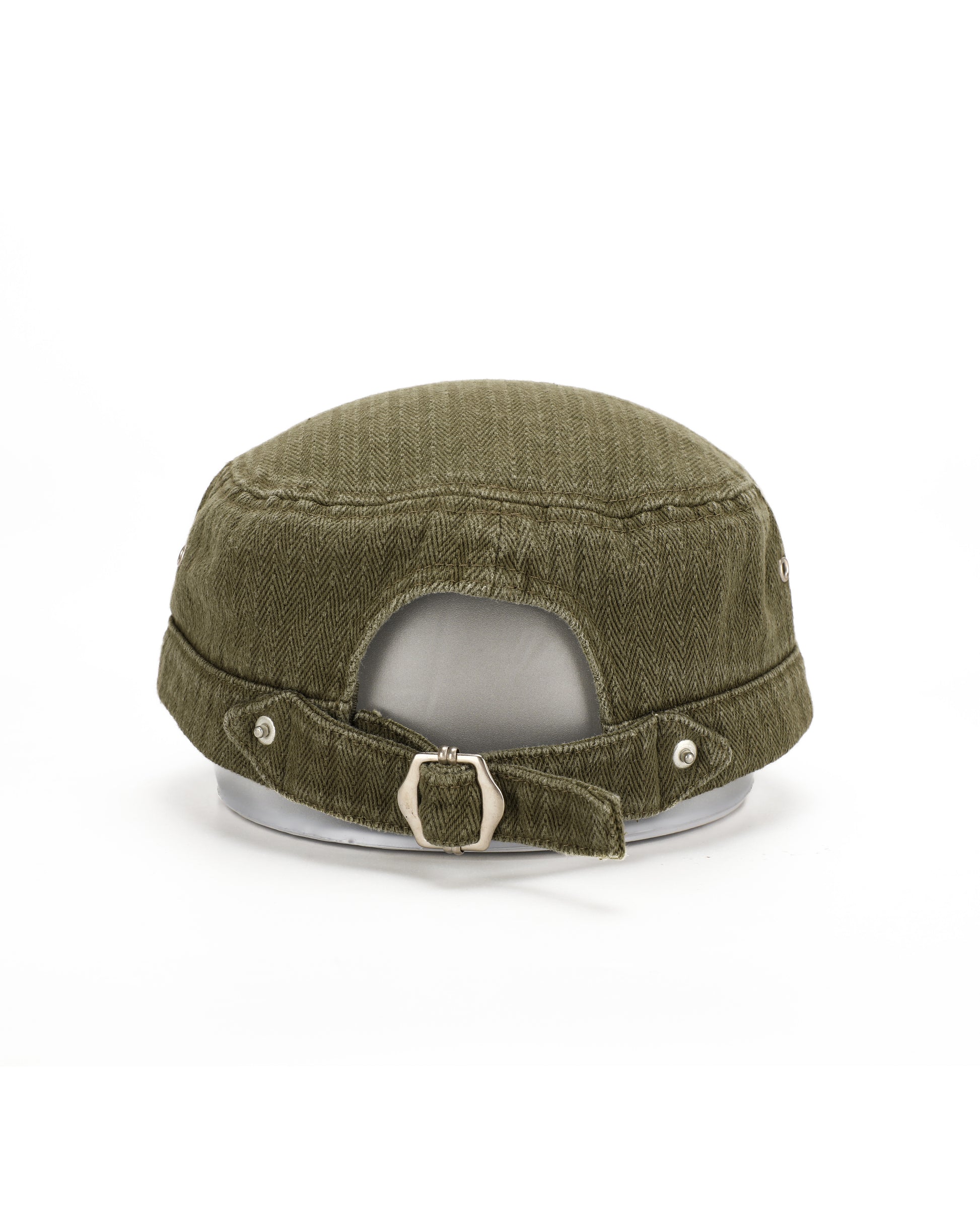 Our take on a vintage cadet hat embellished with a cinch back and fastened with matte silver rivets